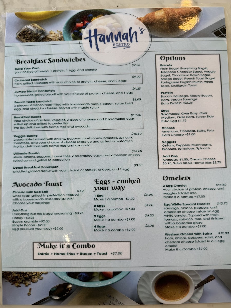 Hannah's Bistro offers a diverse and inviting menu, perfect for any time of day. For a quick snack, their Grab N’ Go section features delightful options like Dog Treats, Fresh Fruit Cup, and Maple Chia Pudding. When it comes to lunch, you can indulge in classics such as the BLT, Turkey Croissant Sandwich, and the indulgent Montè Cristo Griddled Ham And Cheese, as well as a simple Cheese Quesadilla.