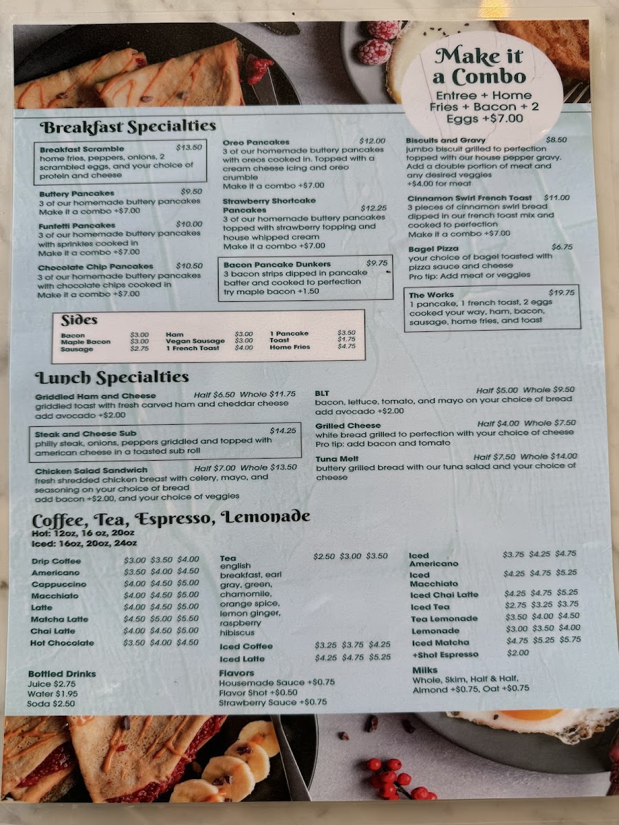 Your choice of pancake, French toast, and 2 scrambled eggs with ham, bacon, sausage, toast, and home fries - y'know the works!
