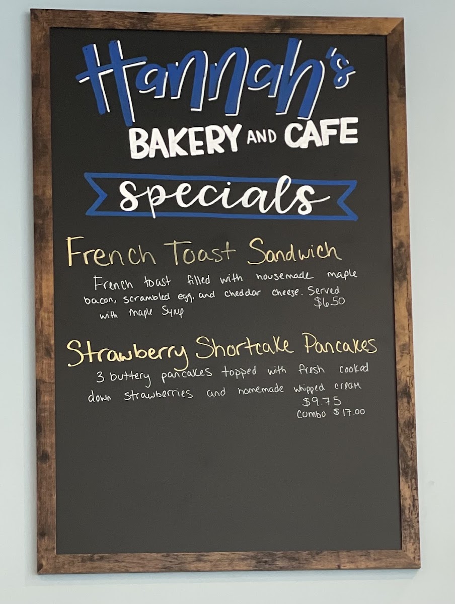 French toast filled with house made maple bacon, scrambled eggs, and Cheddar cheese - served with syrup!